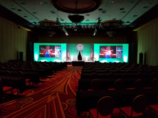 AVVR Creates New Event Look with Ovation E-910FCLike a good chef looking to spice up a familiar dish, Carlyle Kramer wanted to create a new look for his longtime client Hormel Foods at their annual sales meeting. In the past at this event, Kramer and his team at Audio Visual & Video Resources (AVVR) had used a white 9' x 16' surround with uplighting for their stage backdrop. This time, however, they wanted to create a different look by flanking the center stage with two straight walls illuminated from top to bottom in deeply saturated colors. They accomplished this by creating a beautifully colored backdrop using eight Chauvet Professional Ovation E-910FC RGBA-Lime color-mixing ellipsoidal fixtures, supplied by Monkey Wrench Productions. "We decided that having the entire surface area around the screen bathed in rich colors would not only give us a new look, it would also create a more immersive environment," said Kramer. "The only thing holding us back from doing this in the past was that we were concerned about hot spots. When you bathe a whole surface in a color, you run the risk of hot spots, which ruins the whole impression." Kramer was looking for a fixture that could provide a smooth even field of color without hot spots, when he learned about the Ovation E-910FC. "It was exactly what we were looking for," he said. For the event at the Glendale Renaissance, Kramer and his team of Ryan Conlon and Mark Gebhart positioned four Ovation E-910FC fixtures per screen on downstage truss. From these positions, the fixtures covered the backdrop with a consistent field of color. "The colors matched beautifully. Plus, having interchangeable lenses made it easy to get the right sized wash," said Kramer. "Our client loved the look, and we were able change colors very easily remotely to match different themes and even video content." Being LED fixtures, the Ovation units also offered added efficiency. "The low power draw makes it a lot easier to use these fixtures," said Kramer. "They also save on dimming and setup time. At this event, we were able to use eight of the Ovations in place of about 20 of our older LED and incandescent fixtures." In the future, Kramer plans to add more Ovation units to his inventory. So, while the looks he creates at events will continue to change, he says his go-to color-mixing ellipsoidal is likely to remain the same for a long time to come.