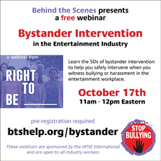 Behind the Scenes to Host Webinar on Bystander InterventionBystander Intervention in the Entertainment Workplace, a 90-minute webinar hosted by Behind the Scenes, will be held on Friday, October 17 at 11am EST. It will teach five easily accessible tools for use in any workplace to intervene without the worry of retaliation. Entertainment industry-specific scenarios will help participants understand how to choose tools to match their comfort level and include ways to help protect themselves and others in the future. According to a statement from BTS, "Bullying, harassment, and intimidation in the workplace are unfortunately common occurrences in all sectors of the entertainment industry. For both the target and the witnesses, these are everyday stressors that are well known but rarely addressed. "How many times have you seen a co-worker bullied or harassed and felt like you couldn't say or do something to safely intervene for fear of reprisal or even losing work? Would you like to feel prepared to safely intervene on behalf of yourself or another?" This interactive webinar is free, but advance registration at btshelp.org/bystander is required to receive the Zoom login. Behind the Scenes continues to partner with Right to Be, a not-for-profit specializing in harassment prevention, to present these ongoing webinars, which are sponsored by IATSE International and are open to all entertainment industry workers. This webinar is offered as part of an ongoing "Stop Bullying" campaign by the BTS Mental Health Initiative. Available resources include downloadable materials to raise awareness of bullying behavior, actions that can be taken to mitigate harm to yourself and/or others, as well as sample policies and procedures for your workplace.