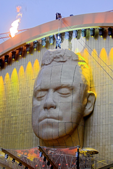 TAIT Creates Large Scale Three-Dimension LED Head for Robbie Williams' Take the Crown Stadium TourWorking alongside designers Mark Fisher, Ric Lipson, and Willie Williams and production manager Wob Roberts, TAIT created an immense LED integrated backdrop for Robbie Williams' European stadium tour, which opened in Dublin, Ireland earlier this month. A 40.8m by 23.1m back wall was created, which was finished with screen-printed, gold polycarbonate panels. The back wall was made from 700 panels incorporating 20 different custom shapes. 18,000 TAIT pixel tablet were inserted into these panels, to create a LED wall. With a focus on sustainability, the pixel tablets were from the system that was used during the London 2012 Olympic ceremonies, and packaged within a new and unique design. These LED-integrated polycarbonate panels formed a video back wall around an immense three dimensional model head of the artist himself. The LED back wall has a door on either side, allowing props to travel on and off stage with ease. Both 6m x 7.73m doors tilt back six-degrees before raising 7.35m when fully opened. Robbie Williams' 3D scenic head was built by creating 50 custom cut panels which were modeled from a scan of the singers face. This scan was imported in to CAD software and moulds of fibre glass were made to match each section. Holes were then drilled to house 50,000 Barco FLX24 pixels within these panels, bringing the huge sculpture to life. The head is 12.6m high and 7.5m wide, containing a hole at the top of his head for the singer to fly from at the start of the show. The head was constructed on six different levels, with a control rack used on each. Sandwich panels support each of the 50 head pieces, with each being set to a specific depth to ensure a seamless and true-to-life face surface. Displaying TAIT's ability to constantly innovate, this is the first time a tourable 3D video model of this scale has been manufactured. Production manager Roberts said, "The back wall was only ever going to be realized by TAIT; no-one else could have come close. Oli Clybouw was instrumental in getting this thing out of the workshop and into rehearsals, and Frederic Opsomer was a man of his word when he said that the job would be completed before the deadline." The design, prototyping and production was completed in just 10 weeks. Video content for the tour was programmed by video director Smasher Desmedt. The artist dedicated the June 25 show in Hampden Park in memory of Mark Fisher.