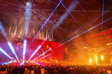 GLP Mad Maxx Creates High Visual Impact over The Weeknd's Touring City Skyline Globally renowned singer-songwriter The Weeknd has become the first major touring artist in North America to use GLP's MAD MAXX CW searchlights -- on his long running After Hours til Dawn world tour, which is set to run until August 2026. The artist's long-term lighting designer, Jason Baeri, had been an early adopter of the powerful fat-beam LED fixture, with its massive 750mm beam diameter, when he specified a pair of heads for the Canadian artist's grand walk-on at this year's Grammy Awards back in February. "But this time, the deployment was very different," he states. "For the Grammys we just needed something that had an awesome amount of power behind it, without having to deploy 20 different fixtures -- like one big 'Fat Light of God.' The MAD MAXX was the most effective tool for the Grammys, whereas this time we are taking advantage of the considerable throw, and the nature of this being a giant sky-tracking object." The MAD MAXX CW houses nineteen 90W white light LEDs (delivering up to 68,000lm). And while it is in the spirit of the classic 3K and 7K xenon arc-sourced searchlights of old, the MAD MAXX carries many advantages, as Baeri points out. "There was a hole left by that generation of space cannons, and this has now been filled by MAD MAXX. It was always tough touring with [the older fixtures] because they required so much infrastructure. But these can run pretty much through the whole show without needing a break. Also, while it's one of the most potent effect lights you will come across, you still need to justify it in terms of truck space and crew. So to have something like this that doesn't require its own special power and separate team is a really big deal." Furthermore, being designated 'No Laser', it doesn't require a separate operator license or permissions. Recently reclassified with an IP66 rating, Baeri knew he would need all of MAD MAXX CW's muscularity, delivered by 12 heads firing up from the stage front, simply to compete with all the other heavy-duty ordnance built into the scenography - including a massive 150' × 60' videowall. The fat beams themselves criss-cross against a composite city skyline backdrop that has been resonating with the fans. "We put them at the base of the skyline to emulate big skytrackers. Their scale, next to that of the scenery, changes them into something huge, making the city feel like it's alive. Their throw covers the full length of a stadium which is really excellent." The new IP66 classification is an important feature. "The fixtures have held up well, including a few torrential downpours," he says. "We didn't lose any to the weather." Rather than using the color wheel, Baeri has opted largely for the fixture's intense white light, to cut through the space. He and programmer Manny Conde are running the MAD MAXX CWs in three segment mode (center pixel plus inner and outer rings): "The three-ring mode worked great and delivers everything that we intended without the need for the additional channels in this instance." The MAD MAXX CWs were supplied by Solotech, with Rob Kennedy as the account manager. "Solotech are family," reasons Baeri. "Rob and the whole team are solutions providers from another age. "The MAD MAXX is definitely doing what was intended. It's an important statement piece as a tool, designed for power, that cuts right through all the other stuff that's going on. It is an incredible fixture and I will certainly be using it again."