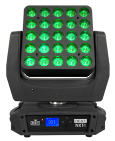 Chauvet Professional Debuts Next NXT-1 Moving Head Pixel-Mapping RGBW Display PanelThe Next NXT-1 moving head LED display from Chauvet Professional will take any production to the next level. A pixel-mapping panel with 25 quad-color RGBW LEDs, the Next NXT-1 combines fast pan/tilt movement with a tight 6-degree beam angle to create in-motion displays that the company says will mesmerize audiences at concerts, festivals, and live productions of all types. The Next NXT-1 is powered by high-performance four-in-one (red, green, blue, white) Osram LEDs, configured in five rows of five, which produce 15,500 lux at 5m. This bright output allows its pixel-mapped images to cut through haze and washes on stage and -- combined with its extremely narrow beam angle -- deliver maximum punch at long throws, when used as an LED wash, making it ideal for concert/touring applications. With its fast 540-degree pan and 270-degree tilt movement, the Next NXT-1 won't have any problem keeping up with other moving head fixtures on the rig, either. Its lightweight housing -- each unit weighs just 30.6lb / 13.9kg -- helps to enhance its speed. The Next NXT-1 was engineered to make the programming process fast and easy for users of all technical skill levels. The panel is equipped with a "virtual-gobo wheel" stocked with static patterns and alpha-numeric characters, allowing designers to create text displays and effects quickly and effortlessly. For more elaborate and customized programming, the Next NXT-1 offers versatile control protocols: Art-Net (106- or 119-channel), Kling-Net, and DMX (10-, 13-, 23-, 106- or 119-channel). Even when creating custom designs, pixel-mapping can be done with exceptional ease by using ArKaos MediaMaster Express Kling-Net software (sold separately), which guides users through the programming process with an intuitive interface that is simple to operate. "If you're looking for a pixel-mapping panel that will add eye candy and really make your tour or production stand out, the Next NXT-1 is your hands-down solution," said Anthony Chiappone, product manager for Chauvet Professional. "It's a very high-impact visual effect with 25 10W RGBW LEDs that produce brilliant multi-color graphics, and an intense narrow beam angle that was designed for long throws in concert-type settings. As a moving head panel, its breakneck pan/tilt speed can keep pace with all your other moving yoke fixtures." "Plus, not only can you use Art-Net and Kling-Net to make incredible pixel designs, but the virtual-gobo wheel feature allows you to access both static and kinetic patterns, and index them just like regular gobos in a moving head. This makes it incredibly easy to build really dynamic shows on-the-fly. It's innovative features like this that really set the Next NXT-1 apart." Featuring a 48mm pixel pitch, the Next NXT-1 has a color temperature range of 2,800K - 10,000K and includes a variable strobe effect. Each panel measures 11.3" x 14.7" x 17.9" (287.6 x 374.6 x 456.5mm), and weighs 30.6lb (13.9kg). The Next NXT-1 features multi-voltage operation: 100-240 VAC, 50/60 Hz. It comes with Neutrik powerCON and etherCON connectors for power and data linking. Up to three units can be power linked at 120V, six units at 208V, and seven units at 230V. The panel can be controlled with either lighting consoles or media servers, providing flexible control integration options.