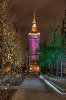 W-DMX Helps Illuminate Warsaw's Palace of Culture Wireless Solution Sweden AB has its W-DMX technology on display at Warsaw's Palace of Culture. The Palace of Culture and Science (Palac Kultury i Nauki, or PKiN) is the tallest and most dominant building in Poland, constructed between 1952 and 1955 as a gift from the Soviet Union to the people of Poland. The 756'-tall building currently serves as an exhibition hall, office complex, radio and television broadcasting center, plus it holds cinemas, theatres, museums, and a conference hall for up to 3,000 people. The building's main attraction is its observation deck on the 30th floor, from which the whole city can be viewed on a clear day. In 2010, a new lighting installation on the building was begun in order to revive the city skyline with a colorful centerpiece -- a project developed with financial support from the European Commission. The central tower of the building, previously lit in white, is now completely illuminated in colors in order to offer a more modern and dynamic lighting concept to tourists and visitors. When it came to selecting the ideal lighting system, the Griven Powershine D RGBW was chosen to illuminate the 551' of the main tower building. Additional Powershine D RGB+W units were also installed on the decks of the four lower turrets in order to floodlight the corners of the tower that were left uncolored. In order to create a contrast between the interior and exterior parts, 48 Danube 45° units were positioned within the windows of the main tower and of the four turrets. The project was completed in February. To successfully reach all lighting equipment around the building, W-DMX by Wireless Solution was selected and supplied. Four W-DMX WhiteBox F-1 and 14 WhiteBox R-512 were used. Wireless Solution provided on-site support with advanced cell planning to choose the right antenna solution to be able cover all four sides of the building. Griven has been a long-term partner with W-DMX in several installations around the world, including Abu Dhabi, Kuwait and now in Poland. Lighting and W-DMX equipment was supplied by Prolight, based in Warsaw. Radoslaw "Radi" Zacheja, sales director for Prolight, said, "W-DMX made this installation possible. The product has always delivered very reliable results and allows designers to bring the beauty of lighting to situations like this." Niclas Arvidsson, CEO of Wireless Solution said, "Prolight has been an extremely strong resource for creative and stunning projects in their region. We were very happy working with them to realize this vision. The palace looks incredible and we're happy we could be a part of it."