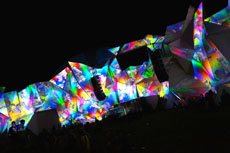 XL Video for Shangri La at GlastonburyXL Video supplied creative video projection and control to the Shangri La area at the 2014 Glastonbury Festival of Contemporary Performing Arts at Pilton in Somerset, UK, helping to give this popular immersive, interactive fictional world a real edge. XL's Nick Diacre project managed two specialist video installations working for technical producers PF Events and their technical production manager Seain Loughlin, who received their brief from Shangri La's creative director Debs Armstrong. The main projection feature in Shangri La was in the Heaven area, involving eight Barco R22 projectors, run as four doubled-up pairs for optimized brightness and mapped to cover a 44m long wooden art-wall structure composed from a myriad of hand-cut tessellated triangles. The work was created by Andy Cross from AN-Architecture. This impressive sculpture represented the cloud of Heaven and was brought alive by the projections which added movement and texturing. It featured several entrances allowing people to pass through to explore other areas of Shangri La. As the structure was a freehand piece of imagineering, all the video mapping had to be undertaken 'on-the-fly' once it was built. Diacre and the XL team took around 200 photos and from these made a detailed composite of the structure which allowed them to map it using one of XL's new Mac Pro servers -- which was also used to facilitate all the video playback. The custom map was then applied to the structure during one of the overnight programming sessions during the set up. The projectors were installed on four towers lined up with each corner of the wall and cross-projected onto the surface. In addition to this, VJs collaborated with the XL team by supplying audio generative content that was played out through the system, and other artists created a raft of custom video material for the project. Diacre was joined on site by XL technicians Richie Jewell, Erica Frost, and media server and control systems manager Christian Dickens. He comments, "It was very much a team effort and we all worked long hours and put lots of energy into making it happen. It was a very exciting way to work and the results spoke for themselves. I can truthfully say I've never had such a strong team, who took on their roles and made such a complex brief look easy." Related but separate to the Heaven installation, XL also supplied projection, media servers and playback control for "The Pyschotron," an artwork by Doug Foster comprising an 8m circular screen mounted in the roof of a geodesic dome with visual art beamed onto it. The projectors were two more Barco R22s, doubled-up driven by redundant Mac Pro servers running Milumin software for both mapping and playback -- which allowed the systems to be independently mapped in great detail and played back synchronized for five days without missing a beat. Loughlin and the PF events team supplied audio and lighting systems to five stages in total across Shangri-La, making sure that all -- Heaven included -- were accompanied by a audio visual experience. Alongside a team of artists and set designers who toiled for weeks in both sun and mud -- the end result transformed a small corner of Somerset into a futuristic dystopia.