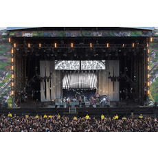 XL Video Tours with Arcade Fire XL Video continues the worldwide supply of production video equipment and crew to multi award winning Canadian indie rockers, Arcade Fire, for the final UK and European festival leg of their acclaimed tour. This follows the success of their third album, The Suburbs, which topped the charts in many territories on release including the UK and US, and is shortlisted for the high profile 2011 Polaris Music Prize. The tour originally kicked off last year in the US, project-managed for XL by Phil Mercer, out of the LA office. In the UK and Europe, it is being managed by Jo Beirne. Richie Stembridge is the visuals designer and video director. The actual stage screen design is a collaboration between him and LD Susanne Sasic, who also created the set concept. Onstage, the main screen is constructed from 49 panels of Pixled F15, which for all the indoor shows is covered by a custom silver spandex skin which diffuses the image and gives the quality and appearance of a projected movie screen surface. Above that is their "marquee" screen, made up from 96 tiles of Pixled F11 built in to 16 of XL's custom touring frames, which facilitate extremely quick rigging and de-rigging. This screen is bordered by strips of individual incandescent light bulbs evoking a classic movie marquee feel. Around Europe, where they have played some of the more off-beat and unusual festivals, often featuring smaller stages, having a light, highly transportable and very easily rig-able system has been a "huge benefit" says Stembridge. His design incorporates eight Sony BRC 300 robo cams which are dotted around, six onstage with wide angle lenses and two at FOH with tele lenses. There are also five static 'lipstick' cameras positioned around the drum kits and on the keyboard riser. All 12 camera inputs are fed into two high spec'd Catalyst media servers, with everything running in composite allowing Stembridge to send 12 video inputs into each Catalyst. With 24 layers of control on each server, he can have a layer for each camera at any time plus a layer for playback content - -giving him a hugely flexible system to mix the show live each night in his own very unique style, tightly cued in some places but with a genuinely organic and spontaneous feel. The Catalysts are triggered from a High End Hog PC and run live on two playback wings, so he has a fader for each camera. All the playback content was produced by Stembridge, who has now worked with Arcade Fire for four years. Some ideas and suggestions come from the band, but he is also given plenty of creative freedom to suggest and experiment with this, which is a stimulating creative atmosphere in which to work. Much of the new footage for this section of the tour he filmed on a flip HD camera, which is perfectly suited to the slightly dirty, grainy and dramatic nature of the images onscreen. Some of the current content has been developed from that of last year's tour, and this is combined with new footage specially made, edited and modified to fit the new screen layout. The mix is roughly half cameras/IMAG and half playback, following the aura of surrealism and teasing out the complex threads to some of the songs in abstract ways which is simultaneously cerebral and beautiful. Stembridge has worked with XL Video on many previous projects and comments, "As always, XL is an excellent supplier. The service is brilliant, the crew is great and we are looked after really well - nothing is too much trouble. It's really also good to have the continuity on a properly international operation when touring the US and Europe".
