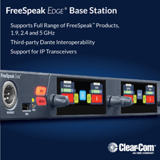 Clear-Com Expands FreeSpeak Family with the FreeSpeak Edge Base StationClear-Com announces the FreeSpeak Edge Base Station, an IP base station that supports the full range of award-winning FreeSpeak digital wireless intercom solutions including 1.9GHz (including both E1 and IP transceivers), 2.4GHz and 5GHz, as well as third-party Dante devices. By offering another base station option to the large community of FreeSpeak users, Clear-Com provides an accessible IP solution to a broad range of its customers. The FreeSpeak Edge Base Station provides a standalone solution for FreeSpeak Edge 5GHz systems, as well as support for FreeSpeak 1.9GHz IP Transceivers via AES67 connections, previously only available through Eclipse Digital Matrix systems with an E-IPA card. The single 1RU device supports up to 16 total beltpacks and 6 IP transceivers, (10 E1 Transceivers), with the flexibility to mix and match bands, as well as up to eight ports of IP interoperability with third-party Dante connections. With a mixture of IP, 2-wire and 4-wire audio ports, the FreeSpeak Edge Base Station can integrate a variety of systems, including Clear-Com Encore partyline and even two-way radio systems with an intelligent GPIO interface. FreeSpeak Edge Base Station is configured through Clear-Com's browser-based CCM software which has been redesigned from the ground up to improve the configuration experience through intuitive menus and functions. The new CCM software offers at-a-glance system monitoring reducing the potential for downtime, the company says. Designed to be quick to deploy, users can be up and running with a transceiver and two beltpacks in less than 5 minutes. Other features include a default system set-up right out of the box, the ability to add transceivers on the fly right from the front panel, and the ability to add beltpacks via USB. All of these result in a system that is well suited for live event settings, or any application where time is of the essence. The 1RU station features two full-color high-resolution touch screen displays with four rotary encoders allowing four talk and listen channels, enabling the station operator to be able to communicate with the wireless beltpacks. "While many of our customers choose an integrated solution with wired and wireless elements all within one system, a large group are still looking for a dedicated wireless operation, often to link to other pre-existing systems," comments Stephen Sandford, senior product manager for Clear-Com. "While we have offered this kind of customer the existing FreeSpeak II Base II up to now, the requirement for an IP-based solution of this type has become increasingly apparent and the FreeSpeak Edge Base meets that need with its IP-based transceiver architecture as well as links to external systems over the most popular IP protocols in the industry." FreeSpeak Edge Base Station is now shipping.