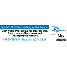 Lectrosonics to Co-Sponsor MultiMic, Multi-Source Mixing for Live Events Webinar Lectrosonics is a co-sponsor of the forthcoming webinar "MultiMic, Multi-Source Mixing for Live Events: DSP Audio Processing for Boardrooms, Courtrooms, Classrooms, and Multipurpose Venues." Scheduled for September 20, it is an opportunity for A/V professionals; system integrators; contractors; acoustician; live sound, recording, and broadcast engineers; house of worship engineers and others to gain insight into high quality, trouble-free audio for event production. In this special NewBay Media Webcast, sponsored by Lectrosonics and produced by Sound & Video Contractor and Mix, participants will learn about system setup and connectivity, including TCP/IP addressability for remote control. Participants will learn valuable tips for fine-tuning auto-mixing functionality to ensure optimum gain before feedback, including the use of filters, delay, and noise suppression on a per-channel basis, along with centralized echo cancellation to guarantee a consistent program. Finally -- recognizing that most boardrooms or lecture halls were not set up with audio as a priority -- there will be tips and techniques for dealing with problematic environments. The webinar will be moderated by Tom Kenny, of Mix Magazine. Ted Hennings, Northwest regional technical director for Swank Audio Visuals; and Chris Thomson, who has been a technical coordinator at Swank Audio Visuals, will be the program presenters. As part of the webinar, participants will learn about the following: • System Setup: The front and back panels • Connectivity: In-house and to the world at large • Noise Suppression and Echo Cancellation • Using Pre-Programmed Effects • EventControl Karl Winkler, director of business development at Lectrosonics, said, "With the rapid improvements being made in display technologies and videoconferencing functionality- not to mention the rise in multipurpose venue construction-the demand for quality audio in event production has never been higher-or more attainable. This program will clear the air of many common misunderstandings." MultiMic, Multi-Source Mixing for Live Events: DSP Audio Processing for Boardrooms, Courtrooms, Classrooms, and Multipurpose Venues is free. Interested parties are encouraged to register online at the URL listed below.